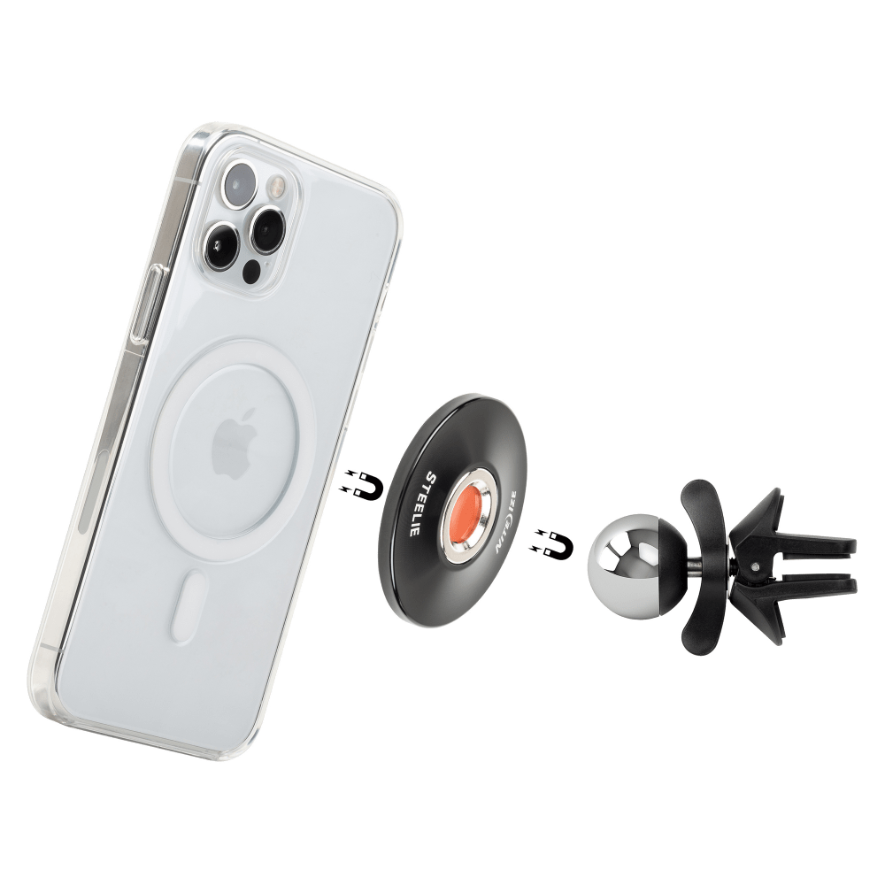 This system includes a clamp-style vent mount that attaches firmly to most vehicle air vents, along with a magnetic socket and ultra-thin metal plate that adheres to your phone or case. The strong magnetic hold keeps your device stable even over rough roads, while the smooth Steelie joint allows a full range of adjustment for portrait or landscape viewing.