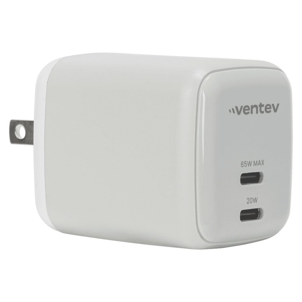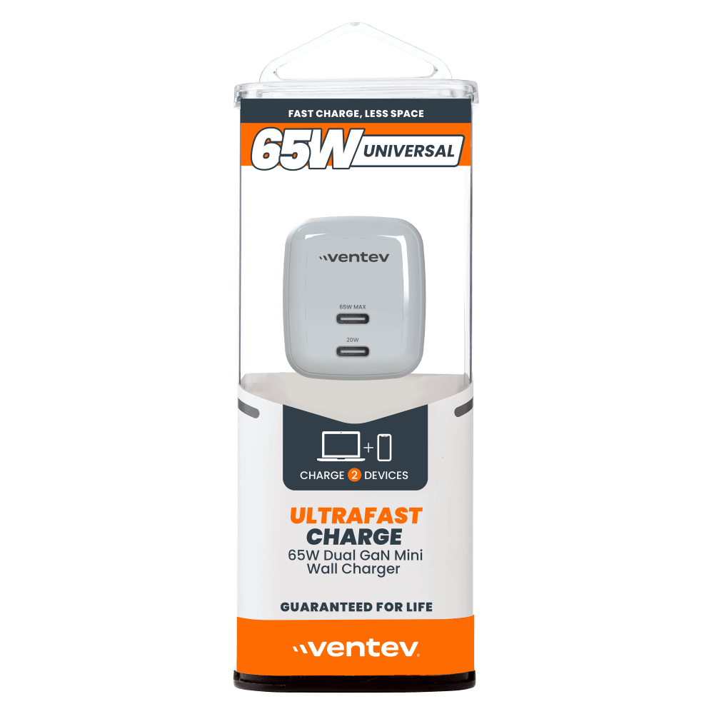 Ventev's Dual USB C GaN Mini Wall Charger packs a powerful punch, delivering fast charging for your laptops, tablets, and mobile devices. Its smart charging technology efficiently distributes power between devices, offering up to 65W for a single device or a combined 45W and 20W for two devices simultaneously. Plus, its folding prongs and lifetime warranty provide added convenience and peace of mind. Trust in Ventev for the fastest and most reliable charging solution on the market.